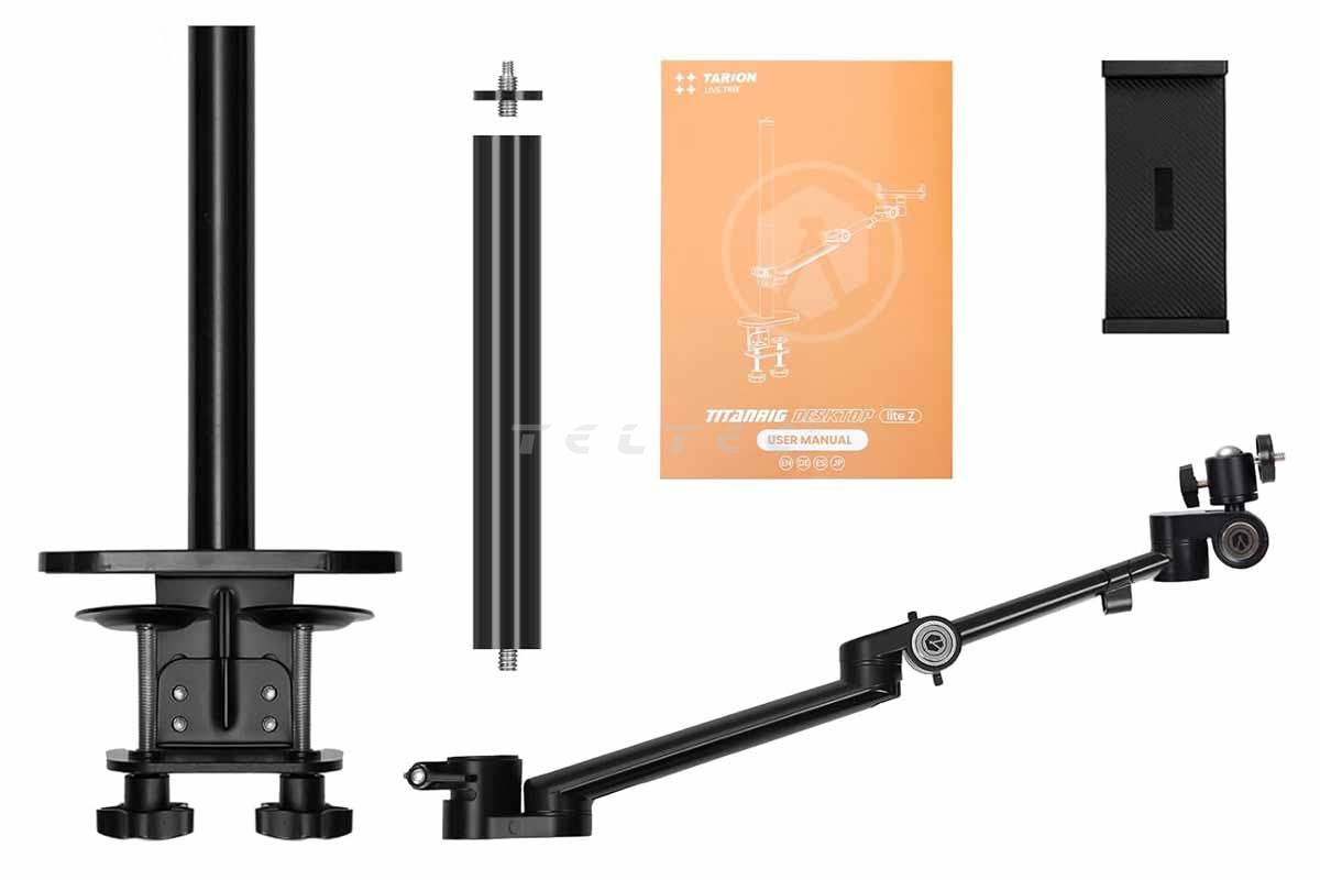 Das Tarion TitanRig Desktop Lite Z ist eine Stangenkombination mit Tischklemme und einem Z-Arm. Durch seine simple Ausstattung und flexible Ausbaufähigkeit eignet sich das TitanRig Lite Z auch schon gut für Leute, die noch keine komplexen Setups nutzen. Dank seiner Beschaffenheit aus stabilem Aluminium kann es mit bis zu 8 kg belastet werden, während es selbst nur etwas mehr als 3 kg wiegt. Der beiliegende Z-Arm ist ideal für Smartphones, Tablets oder leichte Kameras, um schnelle Aufnahmen oder Live-Streams zu veranstalten. Dank der beiden Gelenke im Arm, die jeweils um 180° neig- und 360° schwenkbar sind, lassen sich viele Winkel einstellen, die nahezu jeden Bedarf abdecken dürften.