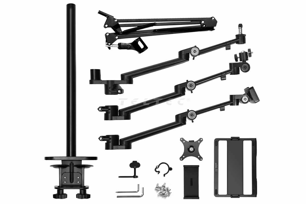 Das Tarion TitanRig Desktop Set ist eine Stangenkombination mit Tischklemme, je einem X-, Y- und Z-Arm sowie einem Mikrofonarm. Durch seine komplexe Ausstattung eignet sich das Desktop Set gut für Leute, die größere Setups nutzen. Dank seiner Beschaffenheit aus stabilem Aluminium kann jeder Arm mit bis zu 7 kg belastet werden. Die beiliegenden X-/Y-/Z-Arme sind mit ihren jeweiligen Aufnahmen für verschiedene Zwecke wie Laptop-/Tablet-, Ringlicht- und Kamera-Halterung, während der vierte, klappbare Arm für Mikrofone gedacht ist. Dank der beiden Gelenke in den XYZ-Armen, die jeweils um 180° neig- und 360° schwenkbar sind, lassen sich viele Winkel einstellen, die nahezu jeden Bedarf abdecken.
