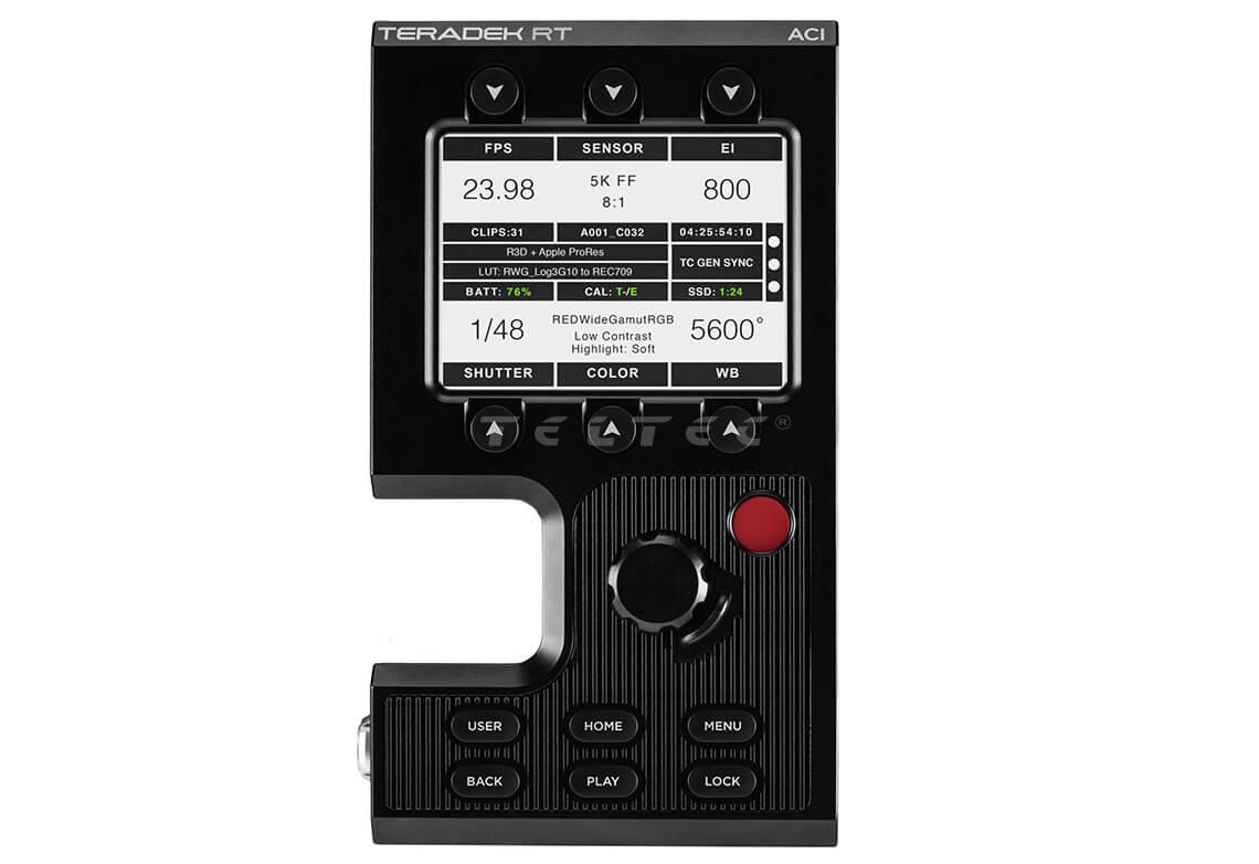 Das Teradek RT ACI-Modul ist ein neuartiges Kontroll- und Management-Interface für RED DSMC2-Kameras, welches eine intuitive Software-Oberfläche mit physischer Kontrolle verbindet. Es fügt sich nahtlos an der Seite aller kompatiblen Kameras an und funktioniert mit jedem DSMC2 I/O-Modul mit CTRL (RS232)-Port. An die Kamera angebracht liefert das Teradek RT ACI alle erdenklichen Kameradaten zu Start/Stop, Sensor, Codec, Timecode, Farbraum, Belichtung etc, welche dann bei Bedarf über die eingebauten Regler konfiguriert werden können.
