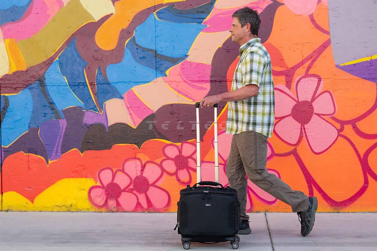 Der thinkTank Airport Navigator V2.0 ist ein 8-Rad-Roller mit Öffnungen oben und vorne für schnellen Zugriff auf Ausrüstung. Zwei Kameragehäuse mit Betteriegrifen passen nebeneinander und sind von oben zugänglich, auch mit einem montierten 70-200mm f/2.8 Objektiv. Die kompakte Größe und hohe Kapazität des Rollkoffers machen ihn ideal für reisende Event- oder Hochzeitsfotografen.