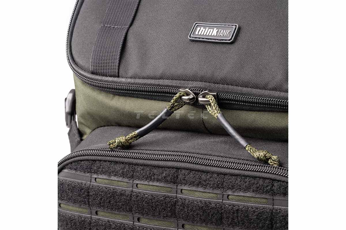 - Taktische Gurtschlaufen an der Seite ermöglichen die Befestigung von Think Tank-Modultaschen