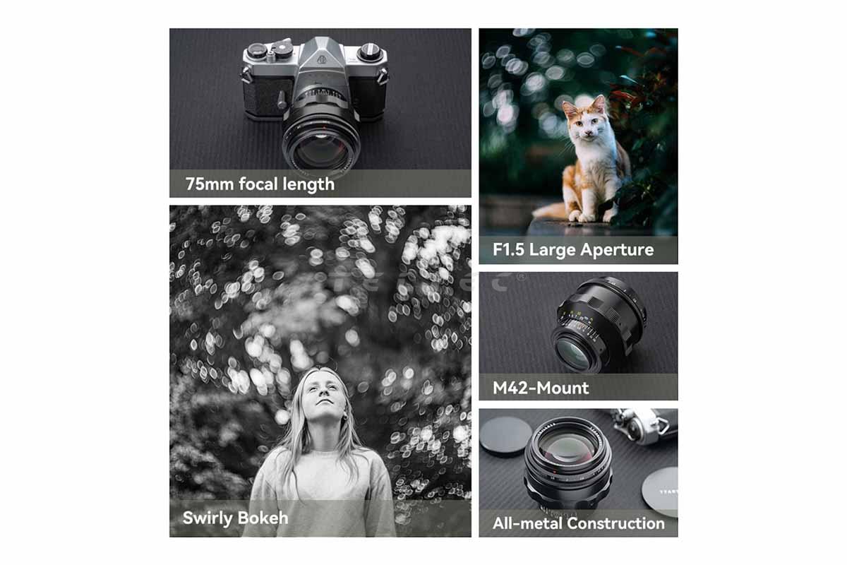 Das TTArtisan 75mm f/1,5 für M42 (Vollformat) ist ein Vollformatobjektiv mit M42-Anschluss, das mittels optional erhältlichem Adapterring an einer Vielzahl an Kamerasystemen verwendbar ist. Die Optik zeichnet sich durch einen Swirley-Bokeh-Effekt aus, der vorallem bei Portrait- und Naturaufnahmen zur Geltung kommt, indem das fokussierte Motiv durch eine kreisrunde Hintergrundunschärfe hervorgehoben wird. Mit einer Blende von f/1,5 ist das Objektiv auch für Aufnahmen bei schwierigen Lichtverhältnissen ideal geeignet. Der Fokusring des TTArtisan 75mm f/1,5 ist im Retro-Design gefertigt und die Blendeneinstellung erfolgt manuell mit einrastender Einstellung.