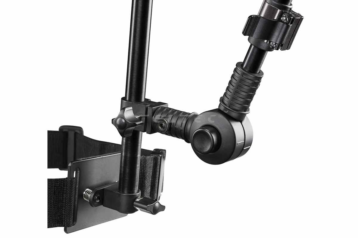 Das walimex pro Schulterstativ ist ein stabilisierendes Rig für DSLR und Systemkameras. Durch die Schulterriemen wird das Gewicht der Kamera auf den ganzen Körper verteilt und macht so einen längeren Einsatz angenehmer. Das Stativ lässt sich individuell an den Körper anpassen und hat ein geringes Eigengewicht von 2 kg. Der Stativarm kann in Höhe und Neigung arretiert werden. Die Entlastung hilft bei der Verbesserung der Ergebnisse.