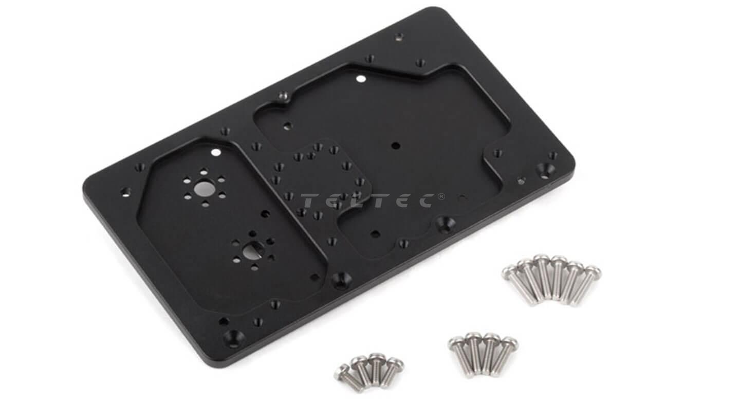 Die Befestigungsplatte bietet Befestigungspunkte für die Anbringung von V-Mount-, Gold-Mount- und RED / Blueshape-Batterieplatten. An der Rückseite befindet sich ein Edelstahl-Clip zum Einhaken an Gürteln oder Taschen. Die Platte ist somit ideal geeignet für den Einsatz in Verbindung mit Gimbals.