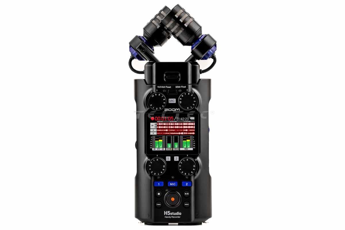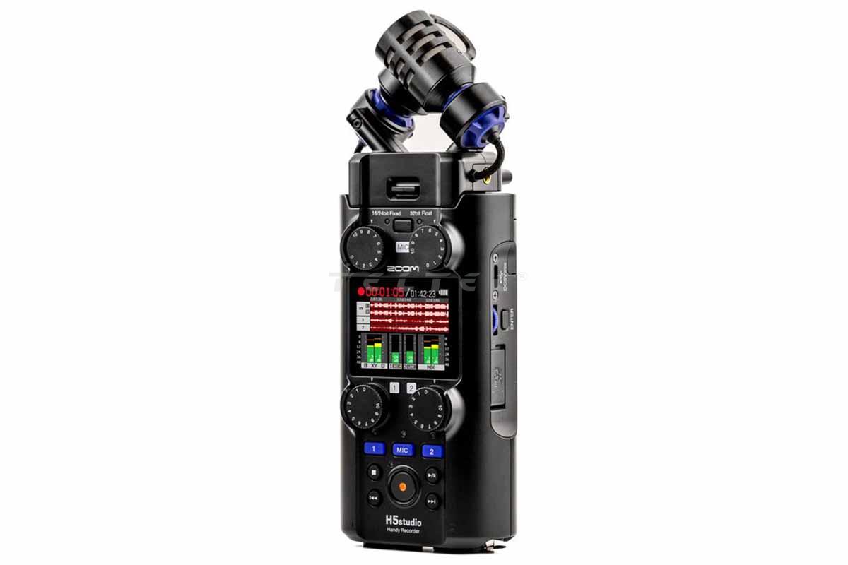 Das Zoom H5studio ist ein portabler 6-Spur Audio-Recorder mit 32-Bit-Float und Reglern. Entwickelt für professionelle Produktionen, ist dieser Recorder mit studiotauglichen Vorverstärkern und Mikrofonen ausgestattet, die mit der 32-Bit-Float-Aufnahme eine sehr gute Klangqualität erreichen. Die 19,4 mm großen Mikrofone weisen einen maximalen Schalldruckpegel von 140 dB und eine besonders hohe Dynamik vor. Diese werden von Vorverstärkern der Zoom F-Serie unterstützt, um eine Spitzenklarheit (-127 dBu EIN) zu erreichen und mit Hilfe der beiden A/D-Wandler sowie der 32-Bit-Float-Technologie das gesamte dynamische Spektrum ohne Rauschen und Verzerrungen abzubilden. Außerdem verfügt das H5studio über Regler, die ein Wechsel zwischen 16-/24- und 32-Bit ermöglichen, sodass man je nach Bedarf deren jeweilige Vorteile nutzen kann. Aufgezeichnet werden bis zu 6 Spuren - 4 Einzelspuren und eine Stereomischung - mit Samplingraten von bis zu 192 kHz. Am Recorder finden sich auch zwei verriegelbare XLR/TRS-Eingänge, die +48-V-Phantomspeisung und +4-dBu-Linepegel unterstützen. Eine 3,5-mm-Stereoklinkenbuchse mit Plugin-Power ist auch vorhanden. Das Farb-LCD kann Eingangspegel und Wellenformen in Echtzeit anzeigen und somit die Aussteuerung und Audioüberwachung erleichtern. Darüber hinaus gibt noch zahlreiche weitere Funktionen und Eigenschaften wie direktes Audiosignal auf eine Kamera, interne 250-mW-Lautsprecher, USB-Ins und -Outs sowie viele andere.